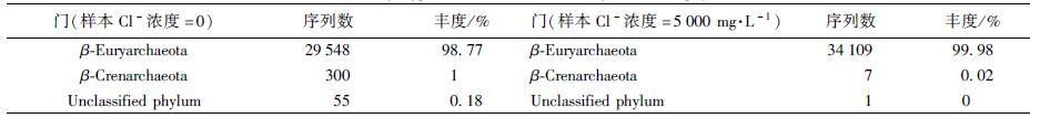 在細菌群中, Cl-濃度為0時的門水平上的主要菌群是β-Chloroflexi(23.86%), β-Proteobacteria(18.99%), β-Bacteroidetes(11.27%), 當Cl-濃度達到5000 mg ·L-1, 占據主體的菌群則變為β-Bacteroidetes(29%), β-Proteobacteria(23.17%)和β-Firmicutes(18.06%).在屬水平上沒有特別優勢的菌屬, 在兩個不同階段優勢最大的細菌分別是Longilinea(7.49%)與Paludibacter(7.69%). Longilinea屬于綠彎菌門(β-Chloroflexi)的厭氧繩菌目(β-Anaerolineales), 可代謝多種碳水化合物. Paludibacter屬于擬桿菌門(β-Bacteroidetes)的紫單胞菌科(β-Porphyromonadaceae), 能發酵多種單糖和二糖產丙酸、乙酸和少量丁酸.當Cl-濃度為0時, 在細菌的測序分析中發現了古菌的β-Euryarchaeota, 因為細菌與古菌的16S rDNA基因序列有較高的同源性, 在對細菌測序分析時也有可能發現古菌, β-Euryarchaeota在Cl-濃度達到5000 mg ·L-1時在細菌的測序中不再占據優勢, 表明鹽度的增高影響了古菌的生長.具體參見污水寶商城資料或http://m.dongaorq.cn更多相關技術文檔。
