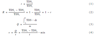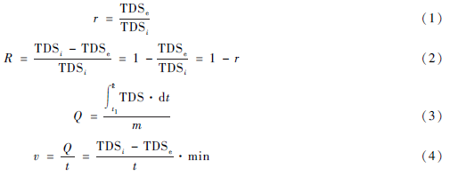 式中:TDSi 為進(jìn)水的總?cè)芙庑怨腆w,TDSe 為出水的總?cè)芙庑怨腆w,TDSe·min 為出水最低總?cè)芙庑怨腆w,r 為相對出水TDS,即出水TDS 與進(jìn)水TDS 的比值(以百分比表示),R 為TDS 去除率,Q 為單位電極對TDS 的吸附量,v 為最大吸附速率,t1 為運行開始時刻,t2 為運行結(jié)束時刻,t 為運行時間,m 為電極質(zhì)量。