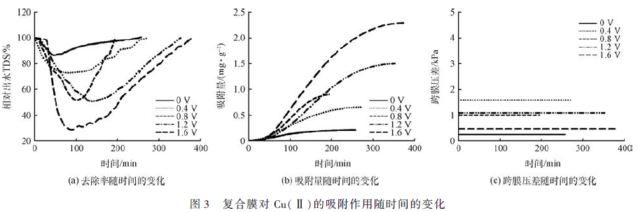 以Cu(Ⅱ)濃度為10 mg·L - 1 ,通量為8 L·(m2 ·h) - 1 為例,探索不同電壓下導(dǎo)電復(fù)合膜對Cu(Ⅱ)的吸附作用隨時間的變化,結(jié)果如圖3 所示。