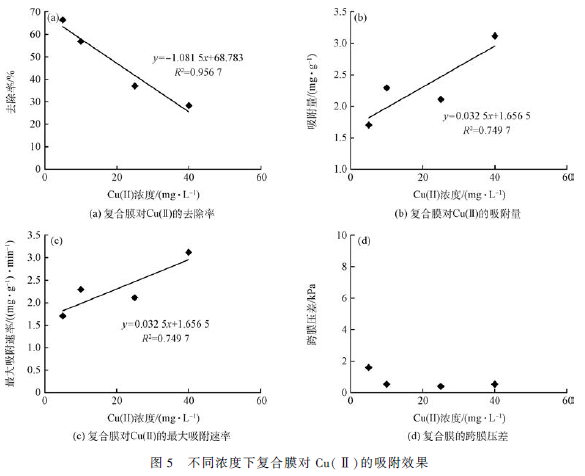 由圖5(a) ~ (c)可知,進(jìn)水Cu(Ⅱ)濃度與去除率、吸附量和最大吸附速率都呈現(xiàn)良好的線性關(guān)系。在電壓1. 6 V、通量8 L·m - 2 ·h - 1 的條件下,復(fù)合膜對Cu(Ⅱ)的去除率隨著Cu(Ⅱ)濃度的升高而減小,本研究中Cu(Ⅱ)濃度為5 mg·L - 1 時去除率最大;吸附量和最大吸附速率隨著Cu(Ⅱ)濃度的升高而增大,當(dāng)Cu(Ⅱ)濃度為40 mg·L - 1 時吸附量和最大吸附速率最大。說明進(jìn)水溶液中重金屬離子的濃度會影響吸附材料對離子的去除率和吸附量。安眾一等利用粉末活性炭電極對銅離子進(jìn)行電吸附研究,選取1. 2 V 電壓,銅離子濃度分別為50、100、150、200 和500 mg·L - 1 。結(jié)果表明,濃度為50 mg·L - 1時的銅離子去除率最大,但吸附量最小。說明低濃度時電極的吸附容量遠(yuǎn)遠(yuǎn)未達(dá)飽和狀態(tài),所以去除率高,但過高濃度的離子會使電極吸附飽和,因而去除率降低,但吸附量和最大吸附速率增大。由圖4(d)可知,跨膜壓差與Cu(Ⅱ)濃度無明顯線性關(guān)系,但總體跨膜壓差維持在較低水平,均低于2 kPa。