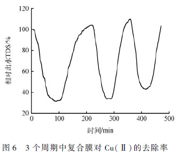 選擇Cu(Ⅱ)濃度為10 mg·L - 1 ,通量8 L·(m2 ·h) - 1 ,電壓1. 6 V,探索本工藝在“吸附-解吸”循環(huán)中的性能,結(jié)果如圖6 所示。由圖6 可知,運行3 個完整“吸附-解吸”周期,系統(tǒng)平均TDS 去除率為60% ,吸附和解吸的平均時間分別為71 和86 min。與單次吸附實驗結(jié)果(見圖3(a)和4(a))相比,其TDS 平均去除率無明顯差別,表明本工藝在3 個循環(huán)周期中“吸附-解吸”性能良好。李少華等 利用活性炭纖維電極進(jìn)行電容去離子脫鹽實驗中,采用短接再生法也得到了類似結(jié)論,但是其研究中極板是平行布置的形式,且未與膜分離技術(shù)相結(jié)合。具體參見污水寶商城資料或http://m.dongaorq.cn更多相關(guān)技術(shù)文檔。