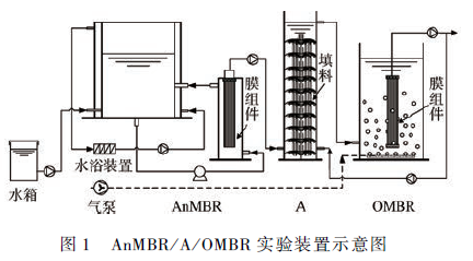 進水從水箱經蠕動泵泵入AnMBR,通過循環泵在膜池與AnMBR 之間循環,保證活性污泥充分混合的同時在膜表面形成剪切錯流。AnMBR 出水經蠕動泵抽出并泵入A 反應器,之后在重力作用下自流進入OMBR,依靠底部曝氣攪動水流使其充分混合。OMBR 出水由蠕動泵抽出后,按回流比2 ∶ 1 回流至A 反應器,以實現處理系統的反硝化脫氮。
