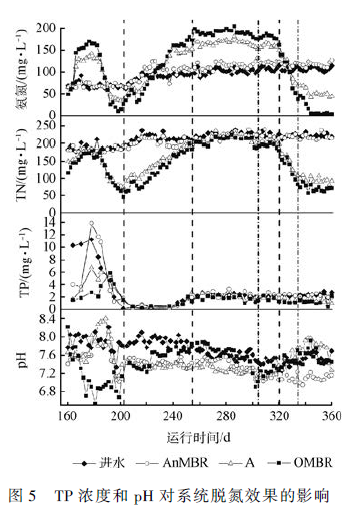AnMBR、A 和OMBR 中的溶解氧(DO)濃度分別控制在0. 01 ~ 0. 2、0. 1 ~ 0. 5 和4. 0 ~ 6. 0 mg·L - 1 ,除AnMBR(溫度恒定37 ℃ 左右)其余反應器均在室溫(25 ~ 33 ℃ )下運行。OMBR 的pH 由Na2 CO3 溶液調節控制。該系統以不排泥的方式運行,僅在膜清洗時有少量污泥流失。膜污染是膜生物反應器運行中需要關注的重要問題,但本研究重點關注系統的運行效果,不把膜污染作為研究重點。實驗過程中膜污染形成后,根據污染情況不定期采用在線清洗、離線自來水清洗和離線化學清洗(10% NaClO 溶液清洗)3 種方式進行膜清洗。所述的在線清洗的頻率為每周一次,離線自來水清洗和化學清洗的頻率為每月一次。