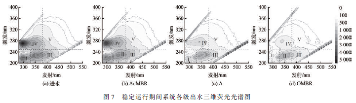 各級出水的熒光峰數量和主要熒光峰的強度變化如表3 所示。由統計結果看出,從進水到AnMBR出水,熒光峰數從58 減少到56,主要熒光峰強度下降15% 左右,與此級的COD 去除率大致相等,而熒光峰熒光強度的總和(ΣFI)增幅較小,可能與此級的COD 降解率較高有關。經過A 和OMBR 處理,OMBR出水的熒光峰數明顯增加但ΣFI 大幅下降,可能與有機污染物經過系統處理后被降解成更多的小分子物質有關。此外,OMBR 出水Ⅰ、Ⅳ區的主要熒光峰強度均大幅下降為進水的17% 和21% ,而Ⅱ區的主要熒光峰強度仍為進水的57. 5% ,是OMBR 出水中強度最高的熒光峰。