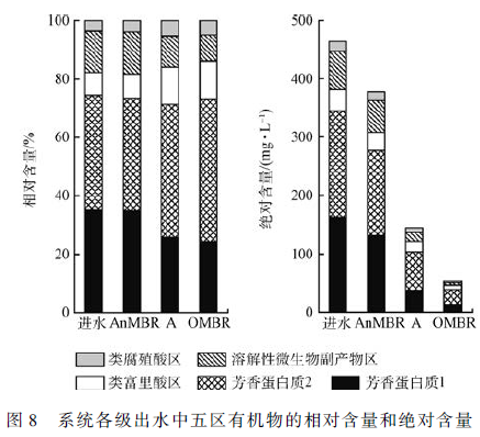 3)進水中Ⅰ、Ⅱ區芳香族蛋白質類似物和Ⅳ區溶解性微生物副產物的總和所占比例達88. 5% ,An-MBR/ A/ OMBR 系統出水中Ⅱ區芳香族蛋白質類似物含量最高,相對較難降解。