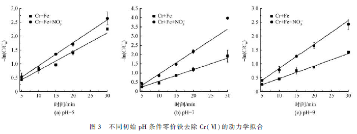 1)批實驗結果表明在不同初始pH 條件下(pH = 5(酸性)、pH = 7(中性)、pH = 9(堿性)),NO3- 的加入均使得鐵屑去除Cr(Ⅵ)的速率升高,初始pH = 7 條件下促進作用最強,達到無NO3- 條件下反應速率的2. 1 倍。