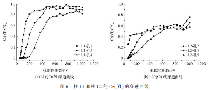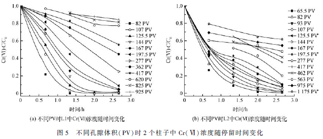 柱實驗在2 個有機玻璃柱中進行。L1 為控制柱通入Cr(Ⅵ)溶液,L2 通入Cr(Ⅵ) + NO3- 的混合溶液。采用鐵屑作為主要反應介質,為了防止鐵屑結塊,將鐵屑與石英砂進行混合。PV 是孔隙體積,1PV = 80 mL。在柱實驗中,PV 常用作時間單位,即1PV 等同于80 mL 溶液通過實驗柱所需的時間。