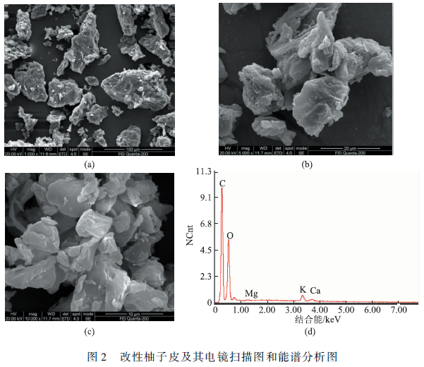 按照質量比為50:1的比例分別稱取柚子皮粉和FeCl3,將兩者加水混合,常溫下攪拌10 min使其混合均勻,再放入鼓風干燥箱在(85士2)℃條件下烘24 h,用樣品粉碎機粉碎后過40目篩,放入干燥器備用。該改性材料電鏡掃描圖(分別放大1 000 、5 000和10 000倍)和能譜分析圖如圖2所示。