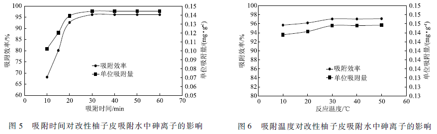 由圖5可知,隨著反應振蕩時間的不同,柚子皮粉對砷的吸附能力也隨之改變。在0一30 min之內,去除率和單位吸附量不斷提高,吸附首先主要在改性柚子皮的外表面和部分微孔內進行,柚子皮含有Fe3+和K+也參與了反應,隨著反應的進行,在20 min之后,柚子皮外表面和微孔逐漸被占據,表面的Fe3+和K+越來越少,顆粒表面自由能逐漸降低,吸附效率減緩,去除率和單位吸附量逐漸趨于穩定,吸附漸漸達到飽和,吸附阻力增加,且此時濃度差減小,吸附推動力也減小,在吸附初期水中砷離子的吸附阻力較小,吸附時間為30 min時,吸附達到平衡,去除率達到了96. 19%,從而獲得最佳的吸附反應時間為30 min。