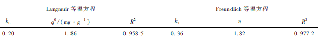 改性柚子皮吸附水中砷離子的吸附等溫線與Langmuir等溫式擬合度和Freundlich吸附等溫式擬合度均比較高(線性相關系數r分別為0. 958 5和0. 977 2 ),且更符合Freundlich等溫方程。通過計算可以得到吸附等溫方程的參數得表1。由表1可知,該改性抽子皮對水中砷離子的最大吸附容量為1. 86 mg / g。