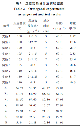 由表2極差分析結果可以得出,4個因素對改性纖維的增重率的影響大小順序是:反應物投加比>浴比>反應時間>反應溫度。4因素中,反應物投加比對纖維的增重率有非常顯著的影響。因此,在正交實驗設計范圍之內,優化得到改性纖維制備的最佳條件為:反應溫度105 ℃、反應物投加比4:3、反應時間7 min ,浴比40:1。