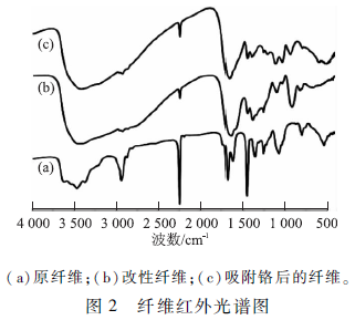 通過EDS測試,得到吸附Cr( Vl)改性纖維的能譜圖見圖3,原纖維、改性纖維及吸附Cr( Vl)纖維的元素組成對比見表3。原PAN纖維的組成元素有C,O,N,對比改性纖維的元素成分,C含量降低,通過肪化反應使氰基變為偕胺肪基,由于基團變大,其相對分子質量也增大,所以C含量降低。對于N元素,由于改性接枝上氨基,N原子數量增多,但同時分子整體相對分子質量增加值比N原子質量增加值大,使N含量降低。對于O元素,改性后纖維接枝上輕基,O含量則增加較多。通過測試數據所表明的纖維組成元素的變化,可以證明纖維已經成功接枝上偕胺肪基團。而對于吸附鉻之后的改性纖維,觀察到C:元素的峰形明顯,說明纖維已成功實現對鉻的吸附,具有特征吸附性。