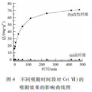 取一定量經過酸處理并干燥好的改性纖維加入50 mL 100 mg / LCr( VI)溶液中,調節溶液的pH值為5,將其置于水浴恒溫振蕩器中,25℃下充分接觸一定時間,采用二苯碳酞二阱分光光度法測定剩余C r(VI)離子的濃度,并經過計算得出相應吸附容量,將其作為改性纖維吸附能力的判定依據。該改性纖維對C r(VI)吸附容量的公式見式(2):