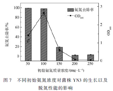 將菌株YN3 接種于不同初始氨氮濃度的培養(yǎng)基中,培養(yǎng)1 d 后測定培養(yǎng)基氨氮濃度,結(jié)果如圖7 所示。初始氨氮質(zhì)量濃度分別為50、100、150、200 和250 mg· L - 1 ,氨氮去除率分別為99. 2% 、98. 3% 、18. 7% 、2% 和2. 8% ,其對應(yīng)的OD600 分別是1. 414、2. 655、0. 6、0. 089 和0. 06,說明菌株生長量與氨氮去除率成正相關(guān)。隨著初始氨氮濃度的提高, 菌株YN3 對氨氮的去除能力越來越低,這是因為氨氮濃度過高時對菌株產(chǎn)生抑制作用,抑制了菌株的生長代謝以及有效反應(yīng)。當(dāng)初始氨氮增加到200 mg·L - 1 ,反應(yīng)1 d 后,幾乎無氨氮降解。說明菌株YN3比較適合初始氨氮濃度在150 mg·L - 1 以內(nèi)的范圍。