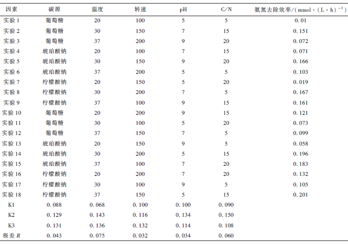 為優(yōu)化菌株YN3 的脫氮條件,以氨氮為唯一氮源,設(shè)計L18 (35 )正交實驗,因素水平表見表1。將菌液以相同接種量接種于裝有100 mL 異養(yǎng)硝化培養(yǎng)基的500 mL 三角瓶中,以氨氮降解效率為反應(yīng)值分析得到最優(yōu)培養(yǎng)條件。初始氨氮的質(zhì)量濃度為70 mg·L - 1 ,依照不同的碳氮比計算碳源質(zhì)量。