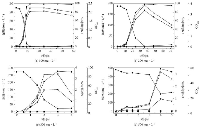 菌體生長狀態(tài)(OD600 )采用吸光度法測定;NH4+ -N 濃度采用納氏試劑分光光度法;NO3- -N 濃度采用紫外分光光度法(HZ-HJ-SZ-0138);NO2- -N 濃度采用N-(1-萘基)-乙二胺光度法(GB 7493-87);細(xì)胞內(nèi)氮的含量采用凱氏定氮法(GB 11891-89),繪制菌體密度和含氮量的關(guān)系圖 ;NH2OH-N 濃度采用間接分光光度法 ;TN 濃度為NH4+ -N、NO3- -N、NO2- -N 和NH2OH-N 濃度之和。