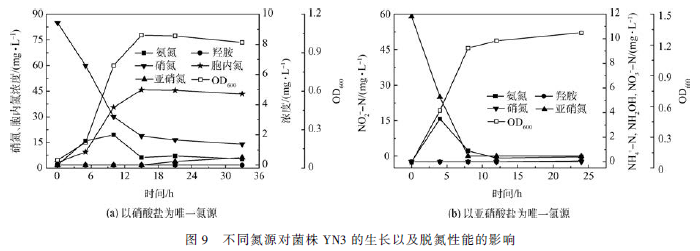 4)菌株YN3 還能夠利用亞硝酸鹽和硝酸鹽進(jìn)行生長代謝,去除率分別為100% 和83. 5% 。