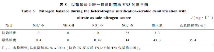 為了直觀了解菌株YN3 在反硝化培養(yǎng)基中氮素的轉(zhuǎn)化情況,在最適條件下將菌株YN3 接入反硝化培養(yǎng)基中,以200 r·min - 1 的轉(zhuǎn)速,30 ℃ 搖床培養(yǎng),定期取樣測定各形態(tài)氮的含量。如表5 所示,以硝酸鹽作為初始氮源,初始總氮濃度為88. 3 mg·L - 1 。培養(yǎng)結(jié)束后,氨氮質(zhì)量濃度下降到14 mg·L - 1 ,同時伴有微量亞硝酸鹽和氨氮的積累,而羥胺幾乎無積累。整個反硝化過程硝酸鹽去除率為83. 5% ,總氮降解率為35. 4% ,即35. 4% 的硝氮通過反硝化作用轉(zhuǎn)化為氣體達(dá)到脫除效果,47. 0% 的氮轉(zhuǎn)化為細(xì)胞內(nèi)的生物量,說明菌株YN3 具有良好的好氧反硝化功能。