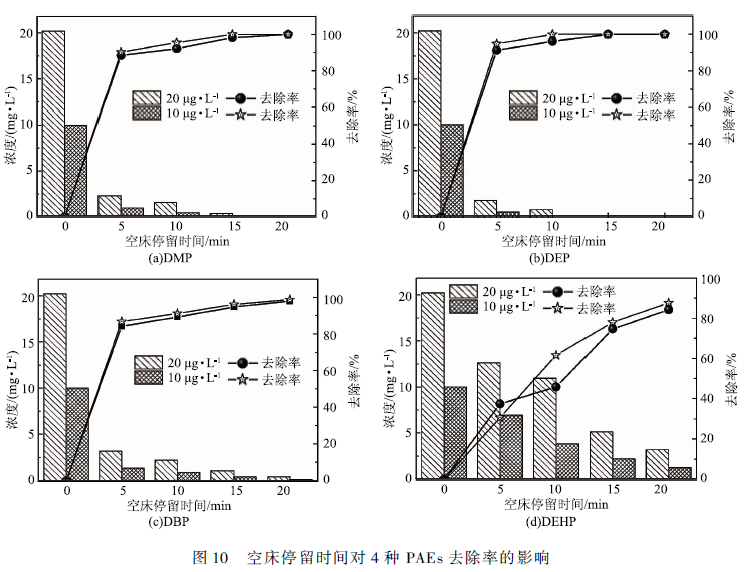 在實際運行中,濾池進水的PAEs含量是變化的,面對進水中可能出現(xiàn)的PAEs含量波動情況,生物活性炭濾池對其的降解性能也會出現(xiàn)變化。實驗考察進水PAEs的濃度為5 ,20和100 μg / L 3個梯度時,在空床停留時間10 min的條件下,測定4種PAEs的去除率變化,結(jié)果如圖11所示。4種PAEs的濃度為5 μg / L 時,DMP,DEP和DBP幾乎全部被去除,DEHP的去除率達到80 %,當4種PAEs的濃度為20 μg / L 時,DMP, DEP, DBP和DEHP的去除率分別89. 75 % ,91.3% ,80. 24%和72. 21 %,當濃度升至100 μg / L 時,4種PAEs的去除率均下降至75. 23 % , 83. 45 % ,75. 49%和55. 429%,可以看出當PAEs的進水濃度逐漸增高,生物活性炭濾池對其的去除率卻在降低。分析原因可能是由于PAEs對微生物存在著毒性,當PAEs濃度超過一定量后,反而可能會抑制降解菌的生長繁殖。