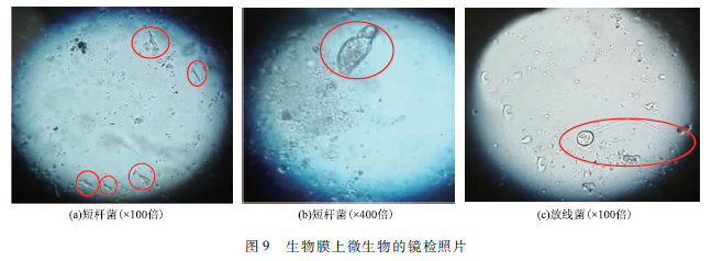 使用光學(xué)顯微鏡觀察活性炭表層附著的生物膜。發(fā)現(xiàn)生物膜上有較多短桿菌和少量放線菌,圖9是短桿菌與放線菌的鏡檢照片。