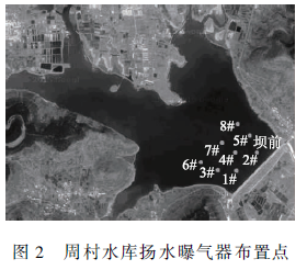 2015年8月末于周村水庫壩前安裝8臺揚水曝氣器(見圖2)。揚水曝氣器設置的目的是改善取水口附近的水質環境,防止出現分層厭氧狀態。其布置的原則為,盡量在靠近取水口附近水深較大的區域設置,設置水域的庫容應保證在設計取水量下達到一定的停留時間。周村水庫上游水深較小,不宜設置揚水曝氣器,壩前水深較大,所以在壩前平行布置,其參數如表1。并以4#曝氣器作為本次研究對象,進行水質與藻類樣品的采樣。