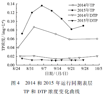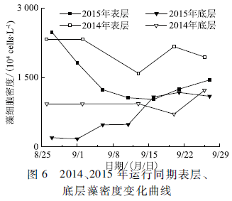 由于內源污染,周村水庫內部磷的負荷隨底部溶解氧的變化表現出季節性的分層現象。熱分層期底層處于厭氧狀態,沉積物中營養鹽釋放到上覆水體,使底層TP濃度明顯高于表層,2015年揚水曝氣運行前底部TP濃度最高為0. 48 mg / L ,運行后底層溶解氧升高,沉積物中磷的釋放得到抑制,底部TP濃度降低至0. 0 1mg / L。與2014年同期相比,2015年表層TP濃度高于2014年,而2015年表層DTP濃度低于2014年(見圖4),說明藻類生長繁殖所需的溶解性總磷降低,對藻類的生長產生影響。同時2015年揚水曝氣運行前表層TN濃度為1. 0 mg / L,揚水曝氣運行后期TN濃度下降至0. 3 mg / L,TN濃度下降約70%。