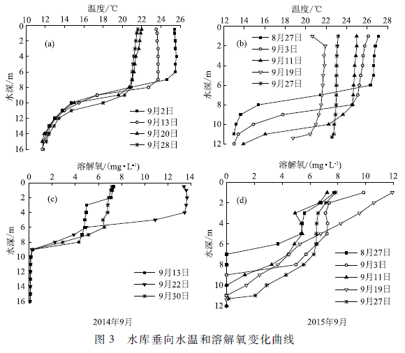 2014年水庫水溫分層現象從4月中旬持續到11月中旬,其中9月份的最高溫度為25. 4℃,最低溫度為11. 6℃,在水深7-9 m處形成明顯的溫躍層。同時,2014年9月在6 -8 m水深處溶解氧迅速降低,水深9 m以下為缺氧狀態(見圖1(a)一(a))。揚水曝氣于2015年8月27日開始運行,9月27日運行結束,相較于2014年同期,揚水曝氣器運行前水庫仍有明顯的熱分層現象。隨著揚水曝氣的運行,上下層水體溫差逐漸減小,溫躍層消失,分層結構逐漸破壞,到9月27日運行結束,水庫最高溫度為23.0 ℃,最低溫度為22. 5℃,水體完全混合,熱分層現象消失。揚水曝氣運行前水深7m以下為缺氧區,揚水曝氣運行使底部厭氧層不斷充氧,上下層水體混合,底部水體溶解氧濃度逐漸增大,厭氧狀態被打破(圖3(b)一(d) )。