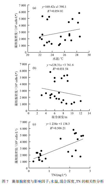 根據公式(1)計算得周村水庫藻類平均生物量如表2。曝氣混合作用將上部水體中的藻類運輸到中、下部水體中,隨著系統持續運行,由于混合層深度增加,可利用光照強度減弱,及氮營養鹽的限制表層藻類無法大量繁殖,而輸送到下部水體的藻類生長受到光照和壓力的限制,藻類數量的增加有限,所以藻類生物總量由2014年的10. 85 mg / L降低到5. 43 mg / L,降低50%。對比運行年和非運行年,將藻類密度的變化與TN,寧昆合深度、水溫進行相關性分析(見圖7)。藻類密度和混合深度、水溫的相關性較差,而揚水曝氣對氮營養鹽條件的改變,對周村水庫富藻期藻類密度的影響較大。