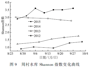 Shannon指數可以表示生物種類多樣性。揚水曝氣器運行前水庫藻類多樣性與2014年同期相近,運行后周村水庫藻類多樣性水平提高,水體生態狀況良好(見圖9)。具體參見污水寶商城資料或http://m.dongaorq.cn更多相關技術文檔。