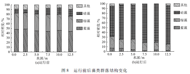 CUSHINC等分別針對強水溫分層和弱水溫分層水體研究了水溫分層對藻類優勢種演替的影響,發現不同藻類可適應的水體水溫分層情況有所不同,所以揚水曝氣系統造成的水體水溫分層的改變對藻類群落結構有顯著影響。