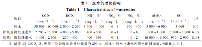 廢水來自某集團纖維素乙醇中試基地的生產廢水,以玉米秸稈為原料,采用稀酸蒸汽爆破預處理、水洗過濾、酶解、C6單獨發酵工藝得到乙醇,發酵液經蒸餾提取乙醇后的塔釜醒液稱之為纖維素乙醇廢水。纖維素乙醇廢水水質可見表1,在對該廢水進行脫氮處理之前需通過厭氧生化處理,降低廢水中有機物、色度對硝化階段的影響,本實驗用水就是經過厭氧生物處理后的廢水。由于纖維素乙醇廢水水質波動大,經厭氧生化處理的出水水質也有較大變化,其主要水質理化指標見表1。