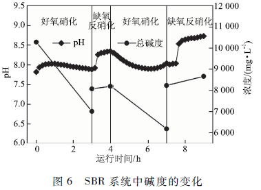 纖維素產乙醇廢水經厭氧處理后堿度大幅增加,SBR反應器進水堿度可達10 290 mg / L,氨氮濃度約為213 mg / L。由圖6可知,在2次硝化反應過程中,堿度均呈下降趨勢,最終降至6 206 mg / L,pH值也相應降低,這是因為硝化反應產生的H十消耗掉了部分堿度,導致系統中堿度減少。亞硝態氮積累到一定程度(≤100mg / L )后停止曝氣,投加適量乙酸鈉為反硝化細菌提供碳源,使得堿度增加,這是因為乙酸鈉作為碳源補償了所消耗的堿度,保證了反硝化反應的順利進行。