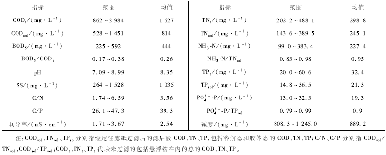 實驗所用黑水的水質(zhì)波動很大,尤其是不同季節(jié)(旱季、雨季)的差異性很大,C/N和C/P均較低,污水的堿度平均僅889. 2 mg /L。
