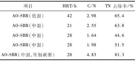歸納前5個工況的運行結(jié)果及本團隊研究的其他工況的實驗結(jié)果,可以得到以下統(tǒng)計結(jié)果,采用單級AO-SBR處理黑水,無論低溫還是中溫,水力停留時間合適時,即低溫HRT達到42 h,中溫HRT達到21 h,當進水的C/N為1. 5一2. 0時,TN去除率為40%一50%;進水的C/N為2. 0一3.O,TN去除率在60%一70 %;當進水的C/N提高到4. 0一5. 0時,TN去除率可達到80%以上。
