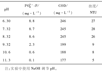 2)直接加堿調(diào)節(jié)pH沉淀磷。人體每天排放0. 12 g Mg,0. 67 g Ca到黑水(人體大小便和沖洗水,體積為25一35 L)中,則黑水中的Mg,Ca離子濃度分別有4 mg / L,22. 3 mg / L,如果黑水呈堿性,則Mg, Ca離子可與磷酸根離子形成沉淀,達到去除磷酸鹽的目的。據(jù)此調(diào)節(jié)SBR出水的pH觀察磷酸鹽和其他污染物的去除效果,如表5所示。可見,出水的pH調(diào)至8.32以前,PO4^3- -P濃度幾乎沒有降低;當pH調(diào)至9.32時,PO4^3- -P快速下降;進一步調(diào)節(jié)pH調(diào)至10. 6 , PO4^3- -P濃度可低至0. 6 mg / L;如果pH調(diào)至11. 3,殘余的PO4^3- -P僅有0. 1 mg / L ,去除率達到99.3 %,與此同時,COD、濁度也分別降至177 mg / L ,5 NTU,去除率分別28.0% ,83.0%。但實驗所用出水的磷酸鹽濃度相對較低,若出水磷酸鹽高達20一30 mg / L,單純加NaOH調(diào)節(jié)pH很難使出水磷酸鹽達到排放標準。磷酸鹽濃度為40 mg / L左右時,投加300 mg / L的Ca(OH)2,磷酸鹽濃度可以降至0. 4 mg / L,相對于硫酸鋁(投加量1 100 mg / L),PAC(投加量1 200mg / L),藥劑投加量大大減少,相應(yīng)的污泥產(chǎn)生量也大大減少。