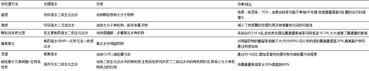 表 5 常用納濾膜預(yù)處理方法及其對膜污染的影響效果