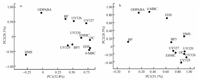 水中,前2個主成分的貢獻率分別為32.8%和20.1%(圖 4a).第一主成分中,EHS、OC和4-MBC的載荷較高.相關(guān)性分析表明,這三者的相關(guān)性均達顯著性水平(p < 0.05),其中,EHS與4-MBC的相關(guān)性顯著(r=0.76,p < 0.001),這表明,EHS、OC和4-MBC可能具有相似的來源.這3種化合物均被廣泛應(yīng)用于具有防曬功能的化妝品(楊艷偉等, 2015),由于現(xiàn)有的污水處理技術(shù)和設(shè)施難以有效去除該類污染物,如我國一些污水處理廠4-MBC和OC的去除率僅為28%~43%(Li et al., 2007).黃斌等(2015)報道了即使采用二級生化處理及深度處理工藝處理,4-MBC和OC的總?cè)コ室仓荒苓_58.8%~94.0%.因此,第一主成分可能反映了化妝品中添加的有機紫外吸收劑經(jīng)生活污水排放對污染的貢獻.第二主成分中,OD-PABA、BP和UV-326的載荷較高.相關(guān)性分析也表明,OD-PABA與BP相關(guān)性顯著(r=0.61,p < 0.001).這3類化合物除了被用于個人護理用品中外,還被廣泛用于工業(yè)制品中作為有機紫外線穩(wěn)定劑.二苯酮類紫外線吸收劑可與纖維形成較強的氫鍵作用力,是棉、麻纖維良好的抗紫外線吸收劑(沈云, 2013);同時,一些品種的二苯酮類紫外線吸收劑已工業(yè)化,并作為光穩(wěn)定劑用于塑料加工工業(yè)(寧培森等, 2008).苯并三唑類紫外線吸收劑與聚合物的相容性較好,穩(wěn)定性也較佳,因此,被廣泛用于各種合成材料及其制品中.它在塑料中,尤其是汽車涂層中是最常用的和最有效的紫外線穩(wěn)定劑(李宇等, 2007),研究區(qū)域內(nèi)分布了大量塑料制品企業(yè)和紡織企業(yè).因此,第二主成分可能反映了來源于工業(yè)制品中添加的紫外線吸收劑的排放.