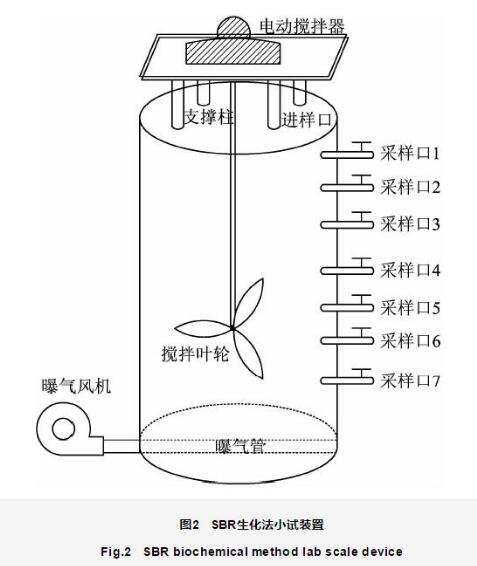 SBR生化法小試裝置由有機玻璃制成(圖2),裝置主罐體為圓柱型,柱體直徑為10 cm,高度為30 cm,總容積約為2.5 L,有效容積為2.0 L。柱體內設有攪拌器,停止曝氣時用于混合廢水。主罐體外部不同高度設有多個取樣口,底部設有曝氣孔和放空閥,用于放空廢水和排泥。