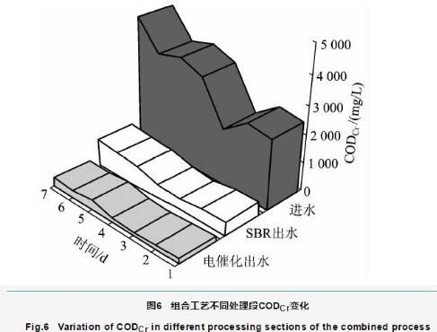 SBR-電催化組合工藝中試結果如圖6所示。由圖6可知,進水CODCr波動較大,為1 881.1~4 669.3 mg/L,進水經24 h的SBR生化處理后,出水CODCr降至303.0~980.0 mg/L,出水CODCr波動減小;將SBR生化處理后的出水作為電催化的進水,以進一步去除難降解有機物,最終出水CODCr為200~300 mg/L,出水CODCr基本保持穩定。SBR-電催化組合工藝對CODCr的總去除率穩定在90.0%左右。與小試規模的SBR生化法處理效果相比,中試規模的SBR工藝段出水效果更好,CODCr的去除率更高,原因是進水量增大后,進水水質趨于穩定,更有利于生化處理,加之中試選取的活性污泥來自工業污水處理廠,其菌種更加適應此類廢水,因此SBR中試效果明顯優于小試試驗效果。