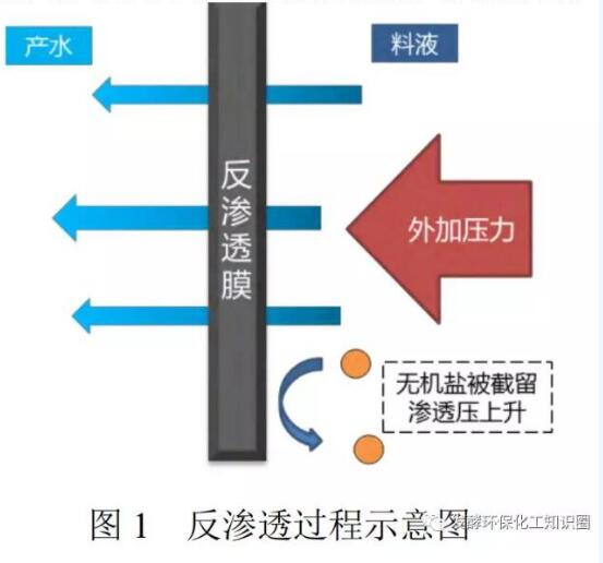 反滲透是以壓力差為推動力,從溶液中分離出溶劑的膜分離過程。如圖1所示,對料液側施加壓力,當壓力超過膜兩側的滲透壓差時,溶劑會逆著自然滲透的方向反向滲透,溶質被反滲透膜攔截。最終在膜的低壓側得到透過的溶劑,即產水;高壓側得到濃縮的溶液,即濃水。反滲透技術是一項成熟的脫鹽技術,目前廣泛應用于飲用水深度處理、工業廢水回用、苦咸水脫鹽、海水淡化等水處理領域。