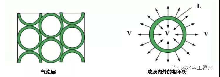 這種在特定環境下形成的氣泡層,液相L依然是連續相,氣泡層內被包裹的氣相V是分散相。氣泡的內、外表面即氣液相傳質的相界面。兩相接觸時,氣泡膜的內外表面上隨即發生相平衡的物質轉移,并完成液膜傳質過程。因為氣泡層內氣泡的直徑較小,因此兩相之間的傳質距離極短,氣泡的數量巨大,氣泡層的更新頻率較高,從而使我們可以在一定時間內獲得遠高于傳統氣液傳質設備的比表面積和傳質速率,大幅度提高設備的傳質效率。