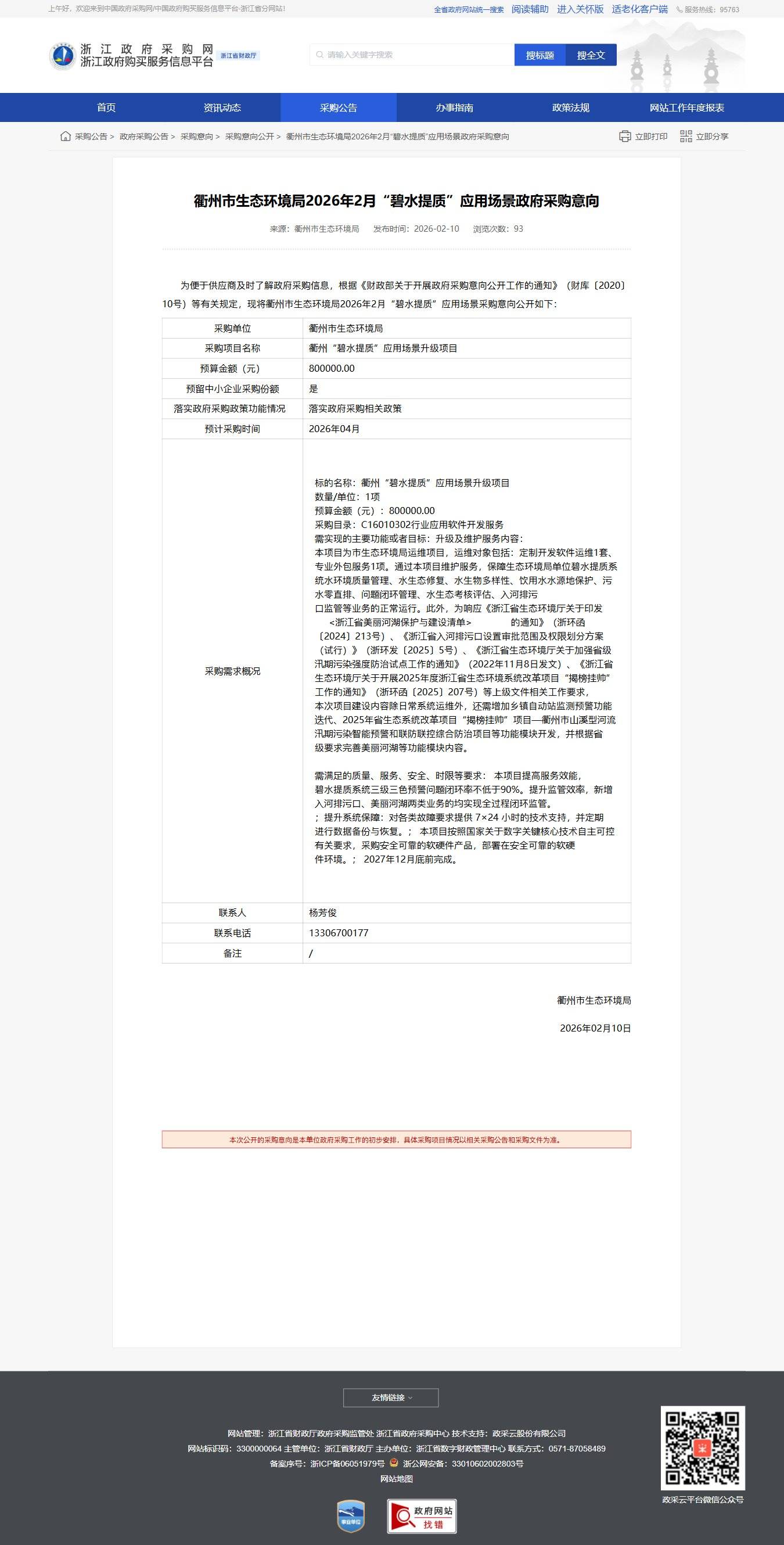 為便于供應商及時了解政府采購信息,根據《財政部關于開展政府采購意向公開工作的通知》《財庫(2020)10號)等有關規定,現將衢州市生態環境局2026年2月“著水提質”應用場景采購意向公開如下: