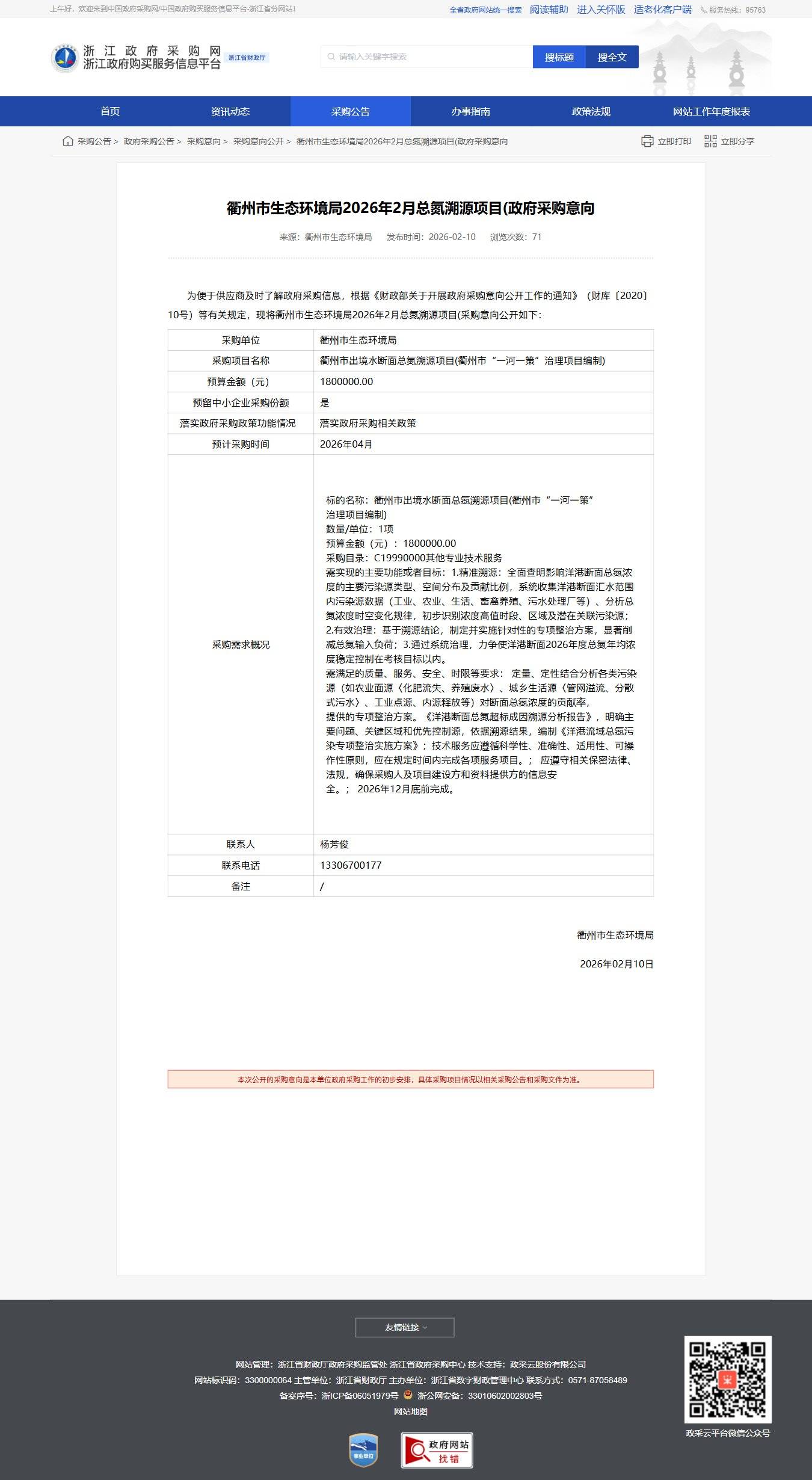衢州市生態環境局2026年2月總氮溯源項目(政府采購意向)