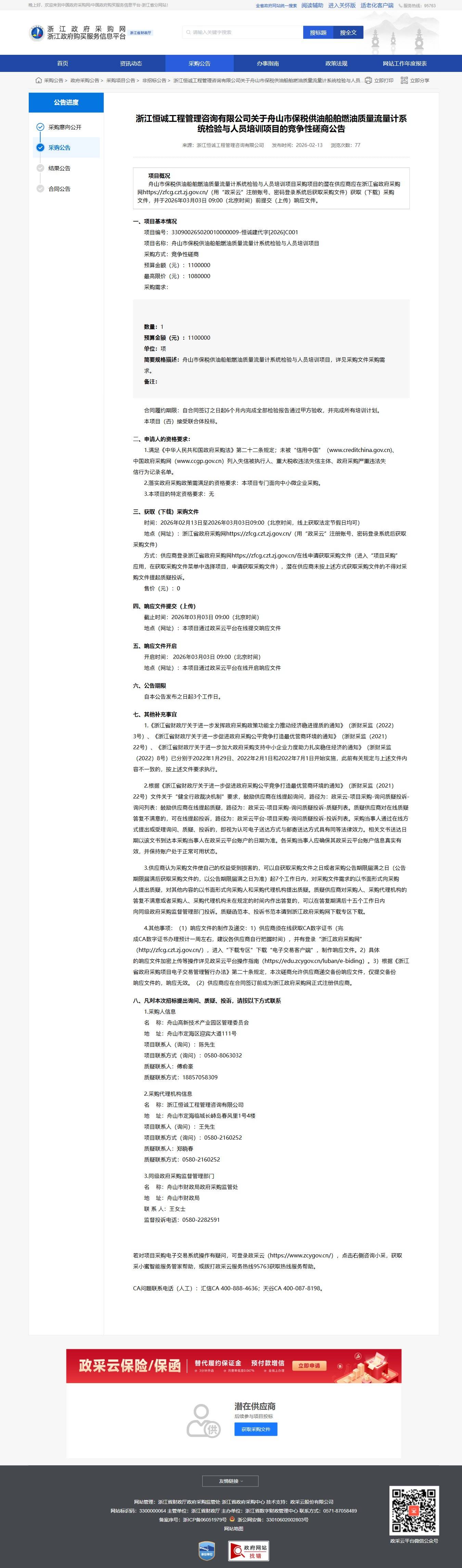浙江恒誠工程管理咨詢有限公司關于舟山市保稅供油船舶燃油質量流量計系統檢驗與人員培訓項目的競爭性磋商公告