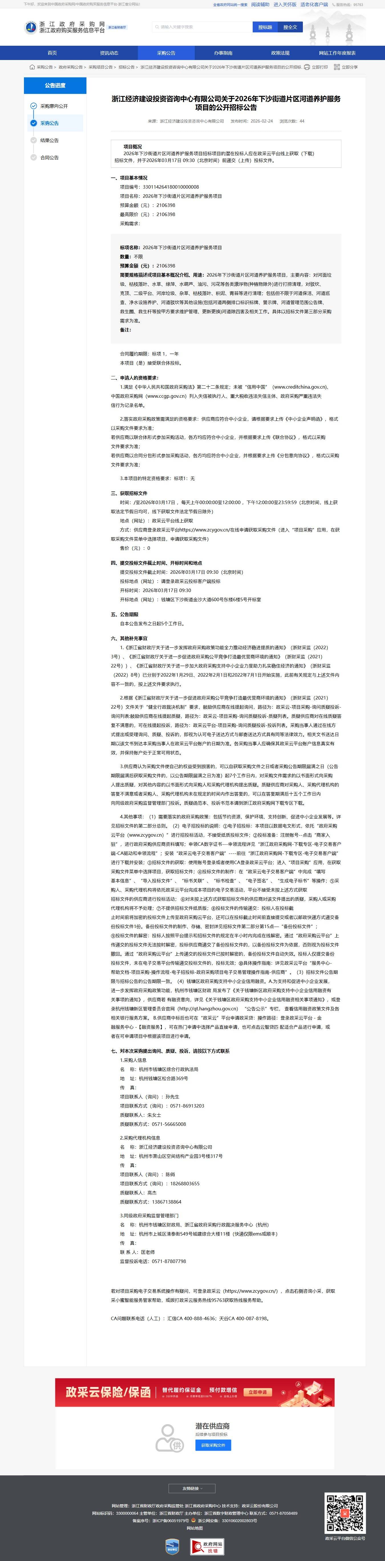 浙江經濟建設投資咨詢中心有限公司關于2026年下沙街道片區河道養護服務項目的公開招標公告
