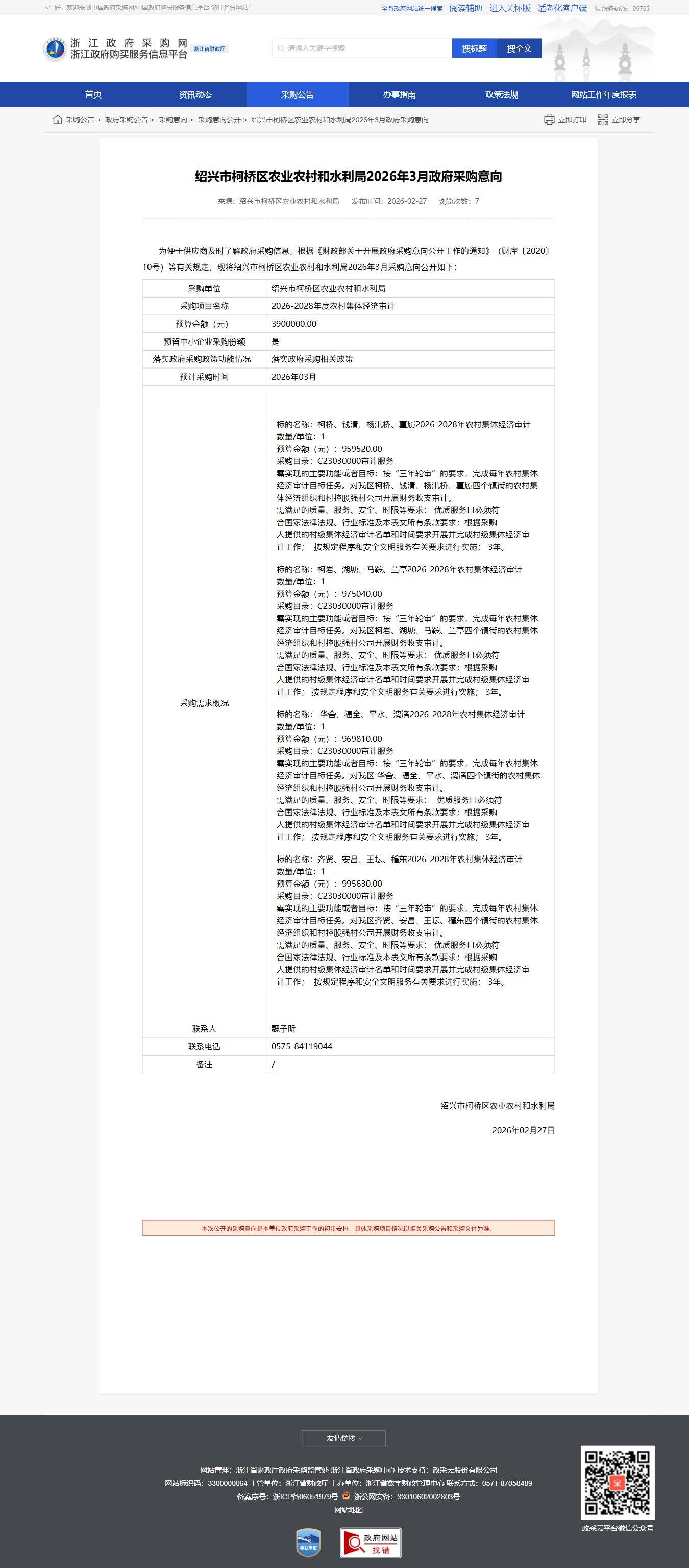 紹興市柯橋區農業農村和水利局2026年3月政府采購意向公開如下:
