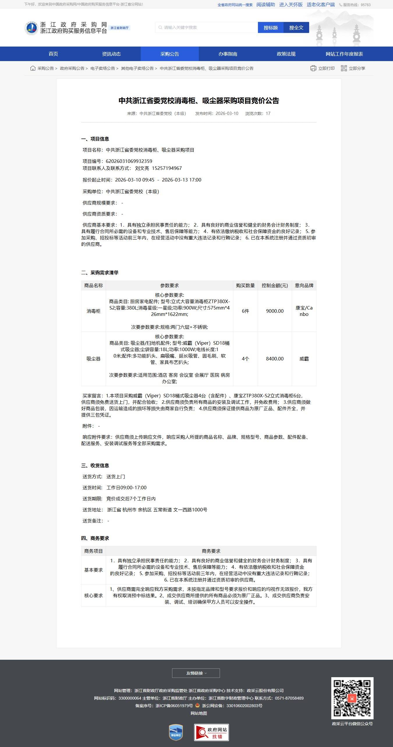 項目名稱:中共浙江省委黨校消毒柜、吸塵器采購項目