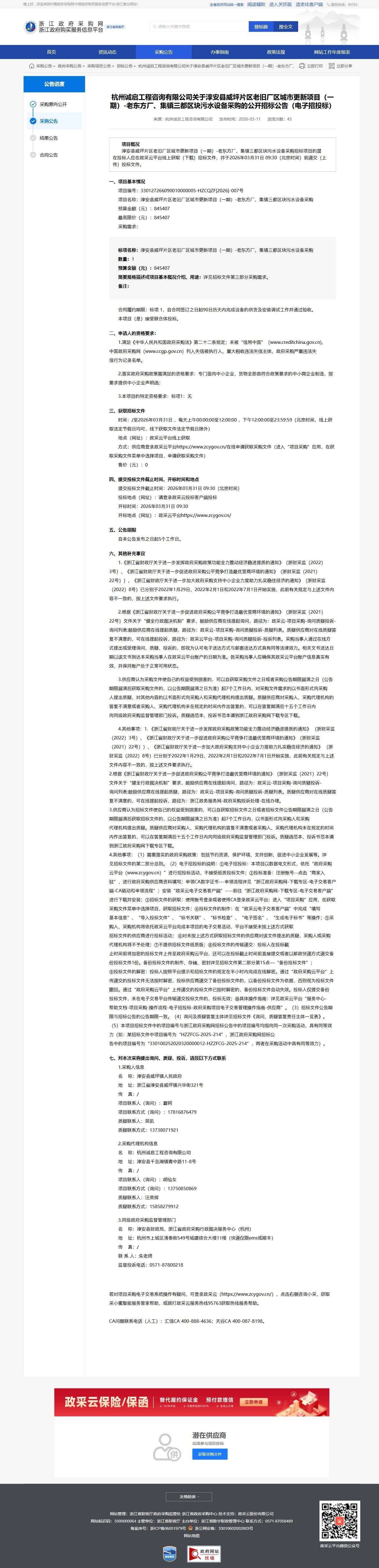 采購需求: 淳安縣威坪片區老舊廠區城市更新項目(一期)-老東方廠、集鎮三都區塊污水設備采購,數量:1,金額:845407元。用途詳見招標文件第三部分采購需求。