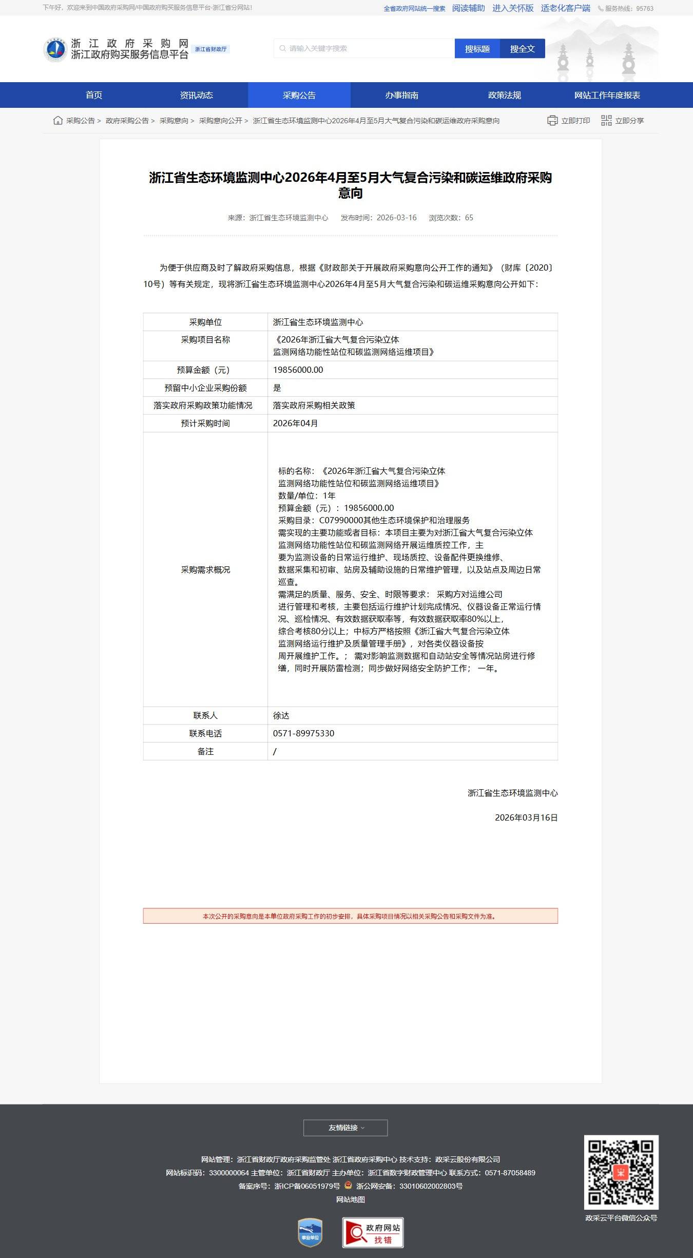 浙江省生態環境監測中心2026年4月至5月大氣復合污染和碳運維政府采購意向公告