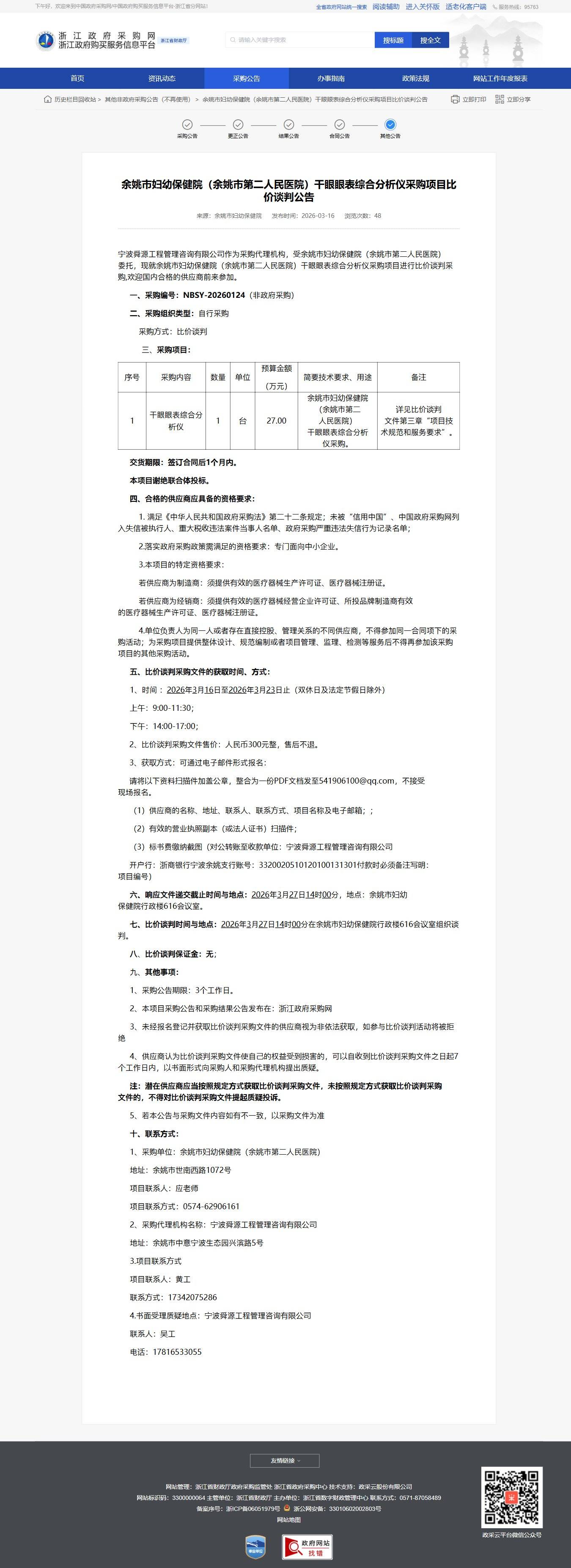 浙江余姚市婦幼保健院(余姚市第二人民醫院)干眼眼表綜合分析儀采購項目比價談判公告